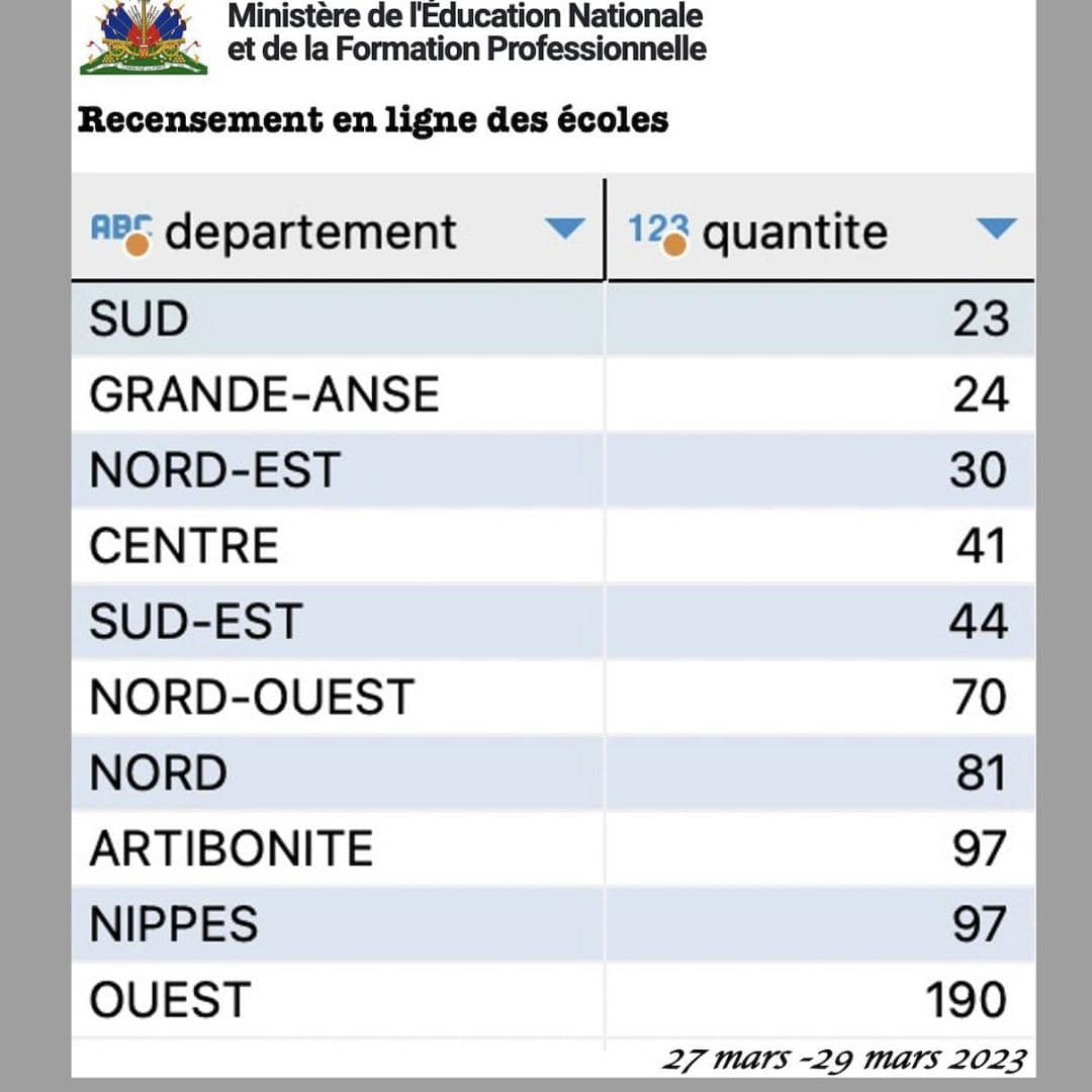 Pwofesè Frisner Orelien ki se Direktè Depatmantal Biwo edikasyon an nan Latibonit, fè konnen demaraj pwosesis resansman sa ap dire yon mwa soti lendi 27 mas pou rive 28 avril 2023, nan sousi pou pèmet tout enstitisyon eskolè yo akredite kòm sadwa nan sistèm edikatif la.