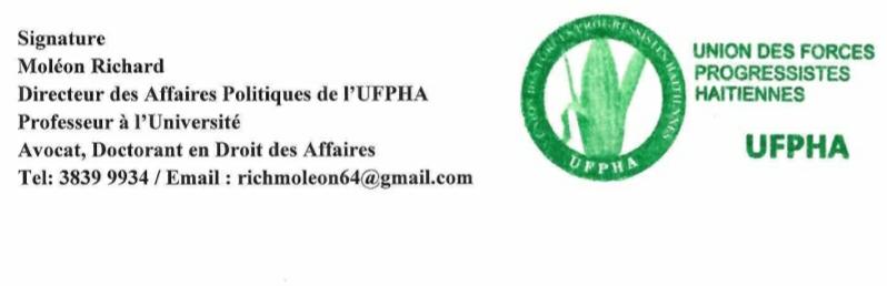 Inyon Fòs Progresis Ayisyen UFPHA ki se yon pati politik adrese yon lèt 20 mas 2024 la ak sekretè Leta Ameriken an, Monche Anthony Blinkin pou prezante li sitiyasyon grav Ayiti ap fè fas la, pran pozisyon kont opsyon konsèy prezidansyèl la etou fè yon propozisyon soti kriz yo estime ki ka pi bon pou peyi a.