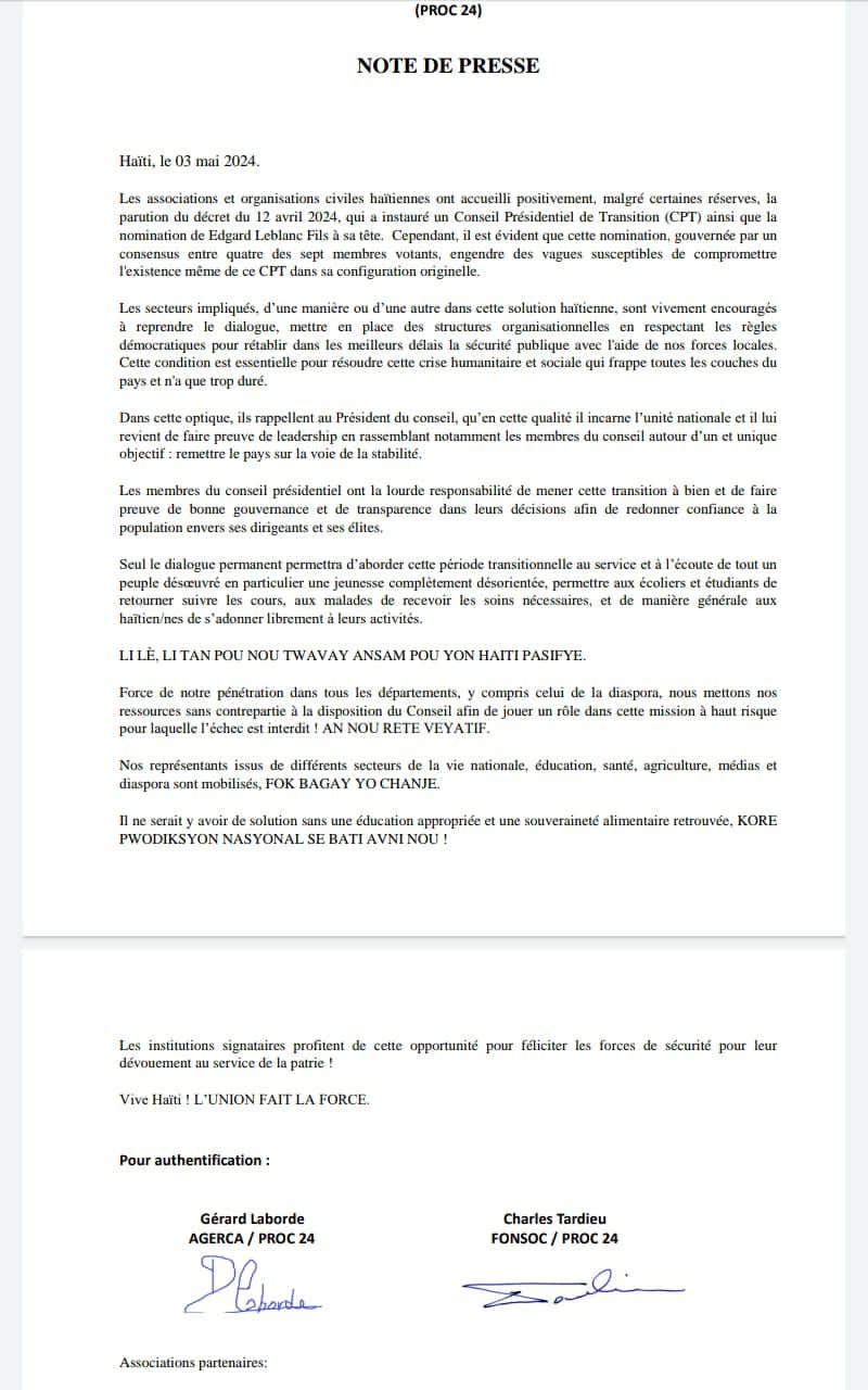 Platfòm Rezo Òganizasyon Sosyete Sivil Ayisyen (PROC-24) nan yon nòt pou laprès 3 Me 2024 la fikse pozisyon yo sou dekrè 12 Avril 2024 la, ki akouche konsèy prezidansyèl tranzisyon an (KPT).