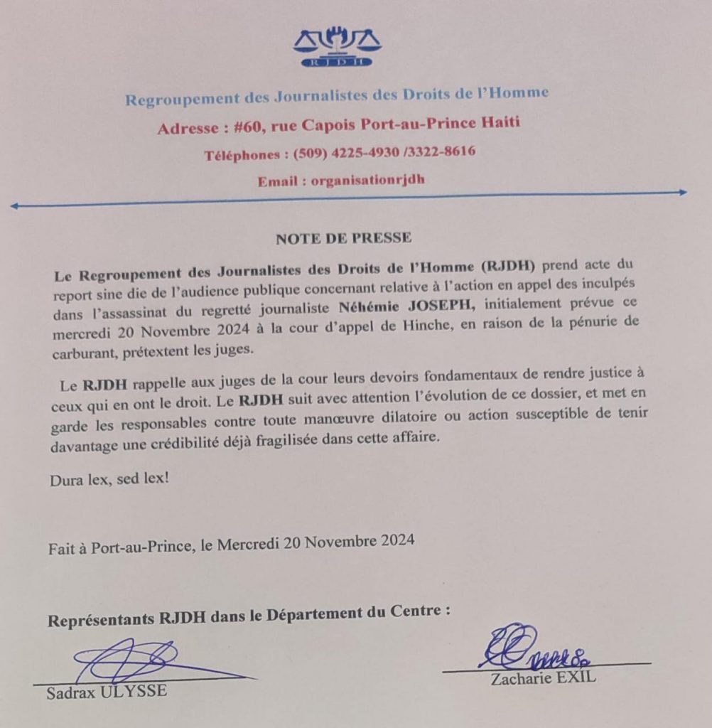 Regroupman Jounalis k ap defann dwa moun yo Ayiti (RJDH) nan yon nòt yo mete deyò Mèkredi 20 Novanm 2024 la, di yo pran nòt sou repò pou yon dat ki poko fikse odyans piblik aksyon an apèl divès enkilpe sou asasina jounalis Néhémie JOSEPH la ki te dwe dewoule mèkredi sa nan lakou dapèl Ench, kote jij yo bay pretèks yo pa ka deplase akoz rate gaz.