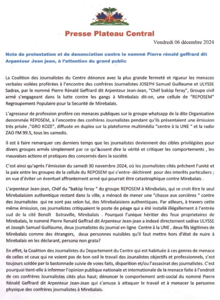 Kowalisyon Jounalis nan Sant lan sot denonse ak tout fòs li zak entimidasyon ak menas ke Pierre Rénald Geffrard, yo rele « Arpenteur Jean-Jean », fè kont de konfrè jounalis nou yo, Joseph Samuel Guillaume ak Sadrax Ulysse. Jounalis sa yo, ki byen koni pou angajman san limit yo nan defann dwa moun ak jistis sosyal, te pran pozisyon nan emisyon yo pou denonse deriv, desizyon enkoerans, ak move pratik ki anpeche devlopman sosyete nou an. Nan emisyon Centre à la UNE ak ZAO FM 99.5, yo toujou soulve sijè ki enpòtan, mete limyè sou enjistis, ak fè apèl pou chanjman pozitif.