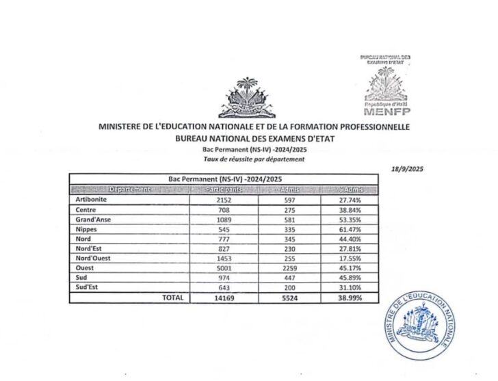 Ministè Edikasyon Nasyonal ak Fòmasyon Pwofesyonèl (MENFP), nan yon kominike nan dat 19 septanm 2025, pibliye rezilta konplè Egzamen Bakaloreya (Segondè 4 ak Bak pèmanan) pou tout 10 Direksyon Depatmantal Edikasyon yo.