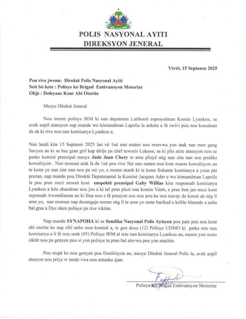 Nan yon korespondans polisye Brigad Entèvansyon Motorize (BIM) k ap travay nan depatman Latibonit yo (komin Lyankou) ekri DG a.i PNH la Vladimir Paraison semèn sa a, polisye yo pote divès doleyans kont « abi otorite » yo sibi anba men responsab Awondisman an, komisè prensipal Jude Jean Chery, ki te ame plizyè sivil nan zòn nan, kote menm sivil sa yo se bandi, selon korespondans lan Centre à la UNE gen yon kopi.