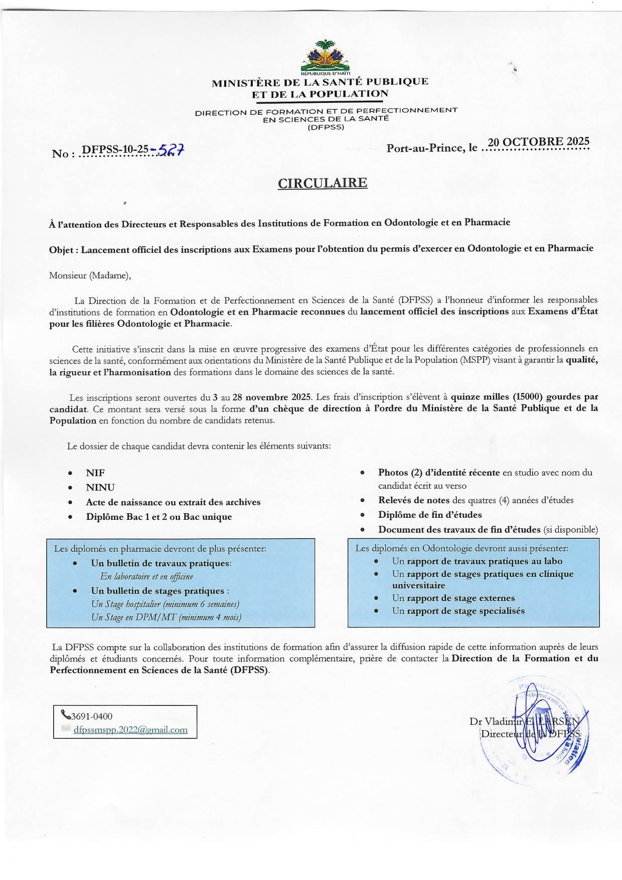Ministè Sante Piblik ak Popilasyon (MSPP) pa mwayen Direksyon Fòmasyon ak Pèfeksyònman nan Syans Sante (DFPSS) enfòme responsab enstitisyon k ap bay fòmasyon nan Odontoloji ak nan Famasi ki rekonèt, nan yon sikilè nan dat 20 oktòb 2025, lansman ofisyèl enskripsyon nan egzamen Leta pou filyè Odontoloji ak Famasi.