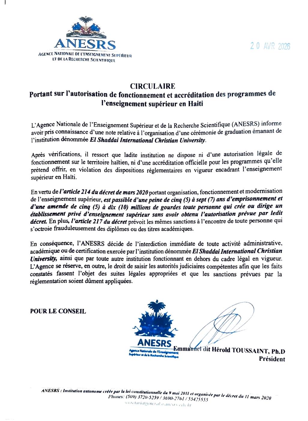 Ajans Nasyonal Ansèyman Siperyè ak Rechèch Syantifik (ANESRS) fè konnen li pran konesans yon nòt 20 avril 2026
